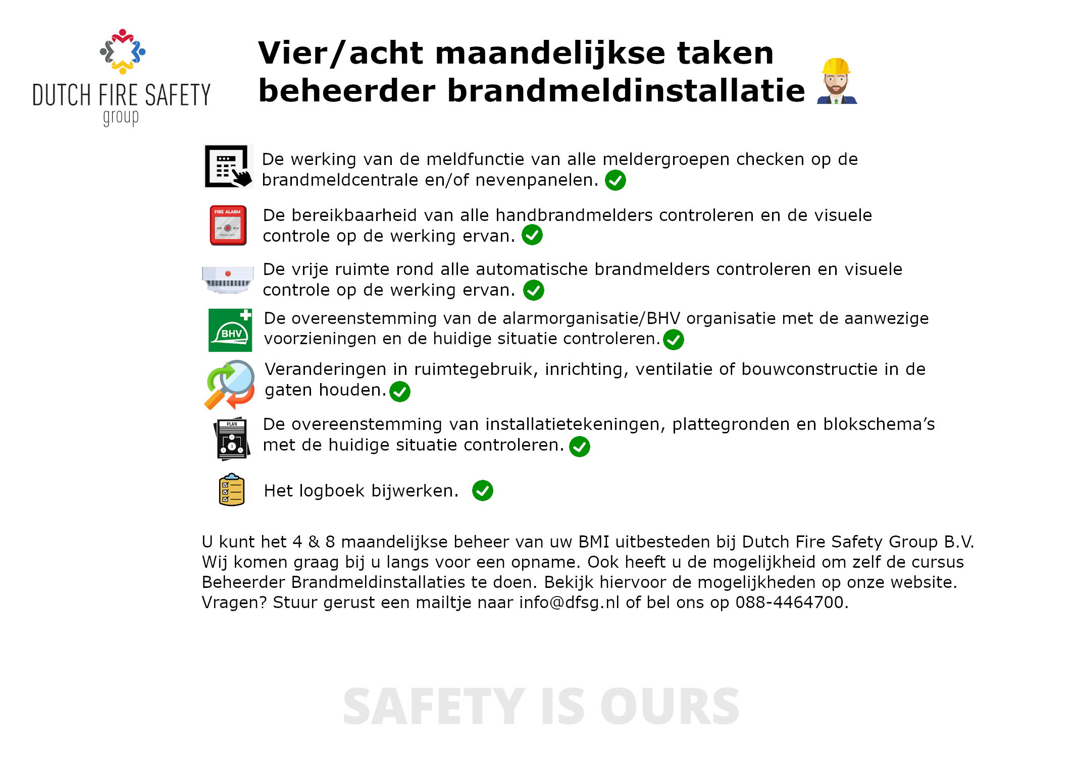 Download hier De infographic ‘Vier- en acht maandelijkse taken beheerder brandmeldinstallatie’.